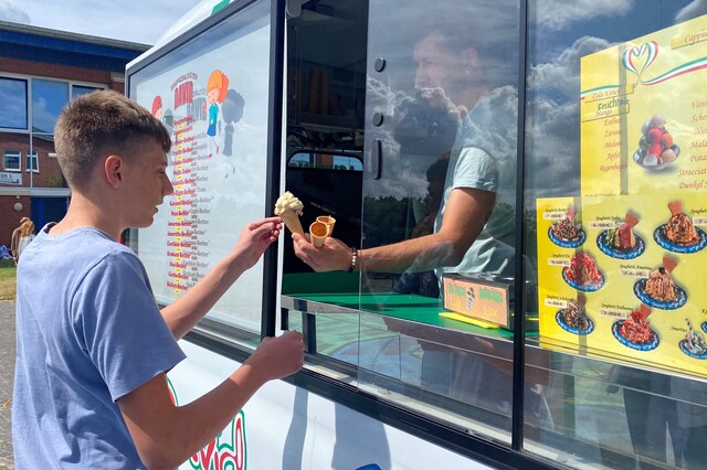 Gerade unsere fünften Klassen staunten nicht schlecht, als David mit seinem Eiswagen vorfuhr. Alle Schülerinnen und Schüler wurden mit einem Eis versorgt und auch die Lehrkräfte ließen sich nicht zweimal bitten.