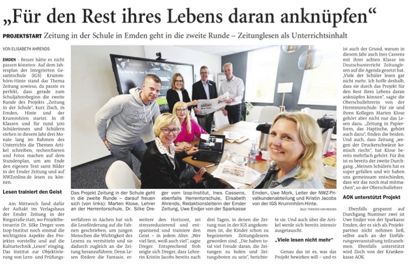Frau Jacobs vertrat unsere Schule bei einem ersten Treffen mit der Redaktion und Projektförder:innen im Verlagshaus und konnte sich bereits einen guten ersten Eindruck vom Projekt machen. Die Schülerinnen und Schüler haben momentan die Möglichkeit, jeden Tag die Emder Zeitung zu lesen und tauschen sich bereits fleißig über das Gelesene aus. Besonders spannend wird es dann bald, wenn gemeinsam mit der Redaktion der Emder Zeitung an eigenen Artikeln gearbeitet wird.