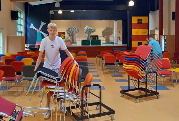 Die Schüler*innen der 9d haben den Männern kurzerhand ihre Hilfe angeboten und sehr motiviert Stühle von A nach B gebracht und aufgestellt. Im Anschluss gab es ein dickes „Dankeschön!“.