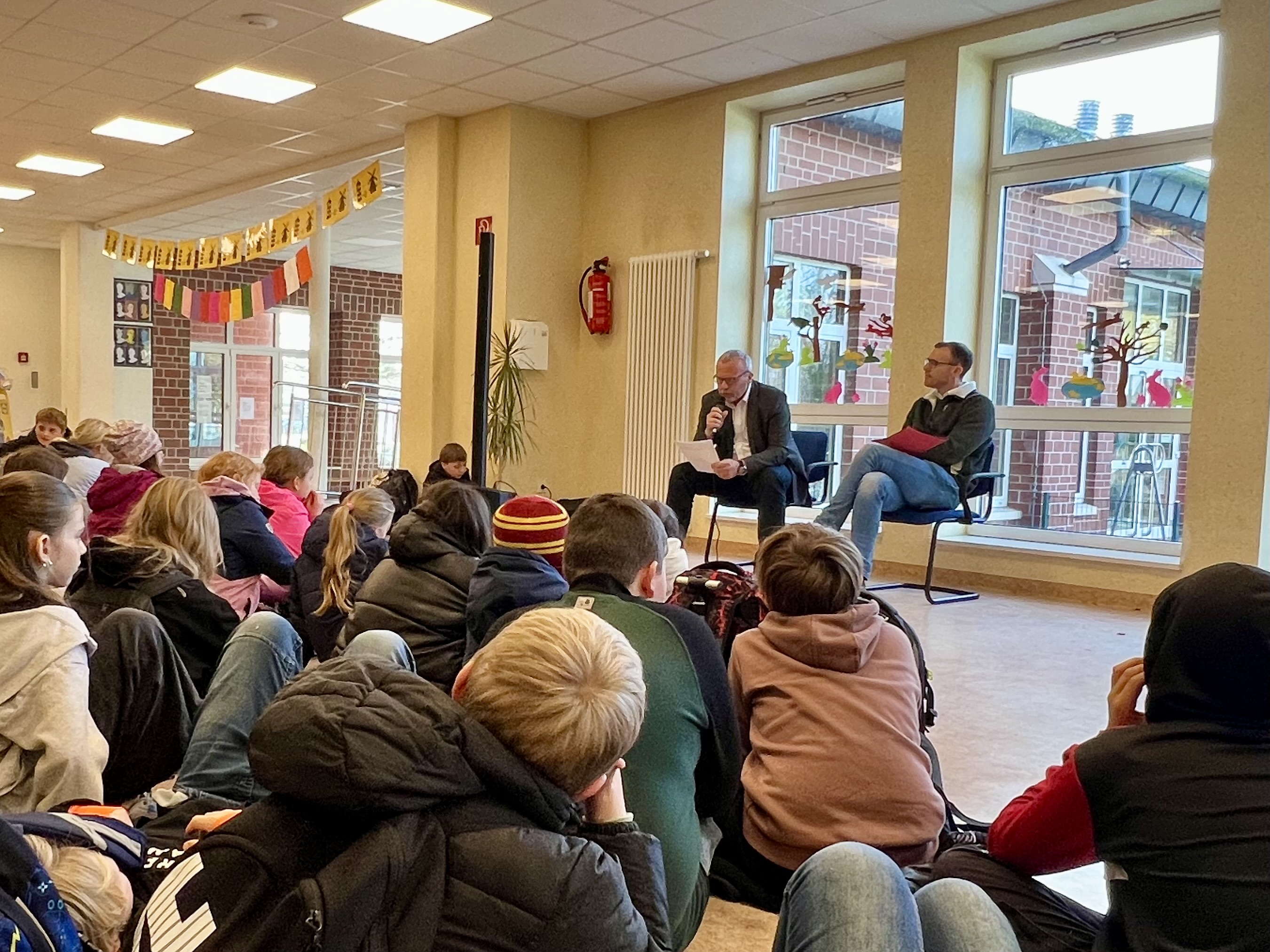 Am Ende der erfolgreichen Bücher-Schatzsuche las unser zweiter Ehrengast, Bürgermeister Uwe Redenius (Hinte) dem 5. Jahrgang in der Pausenhalle eine Geschichte über das Schöfeln in Hinte vor.