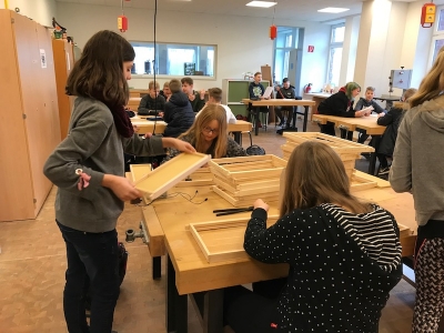 Diese Woche wurde damit begonnen die Rähmchen, auf denen die Bienen später ihre Nachwuchs großziehen, zu fertigen. Dazu mussten Abstandhalter aufgenagelt werden, Dräthe gespannt werden und zu guter Letzt wurden Mittelwände aus Bienenwachs eingelötet.