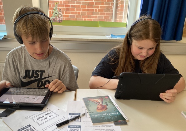 So konnten sie dank der App mit ihren Lesepartnerinnen und Lesepartnern gemeinsam in ihrem eigenen Tempo während des Lesens dem Hörbuch lauschen, um an ihrer Aussprache zu arbeiten. Mit Tablet und Pencil durften sie ihre Lieblingsszenen zeichnerisch umsetzen oder sich anhand von selbst erstellten Online-Kreuzworträtseln und Video-Quizfragen gegenseitig herausfordern.