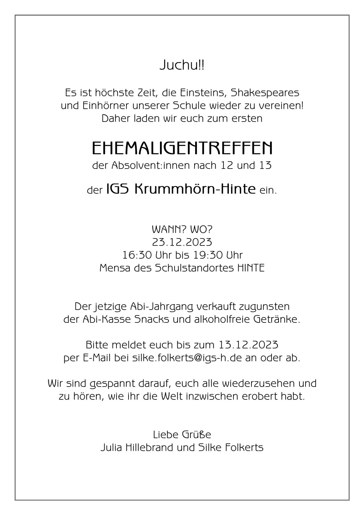 Mittlerweile blickt unsere Schule auf einige Abiturjahrgänge zurück. Diesen möchten wir nun die Möglichkeit bieten, bei einem Ehemaligentreffen an unserer Schule an ihre alte Wirkungsstätte zurückzukehen, um dabei zeitgleich auch noch den aktuellen Abiturjahrgang zu unterstützen.