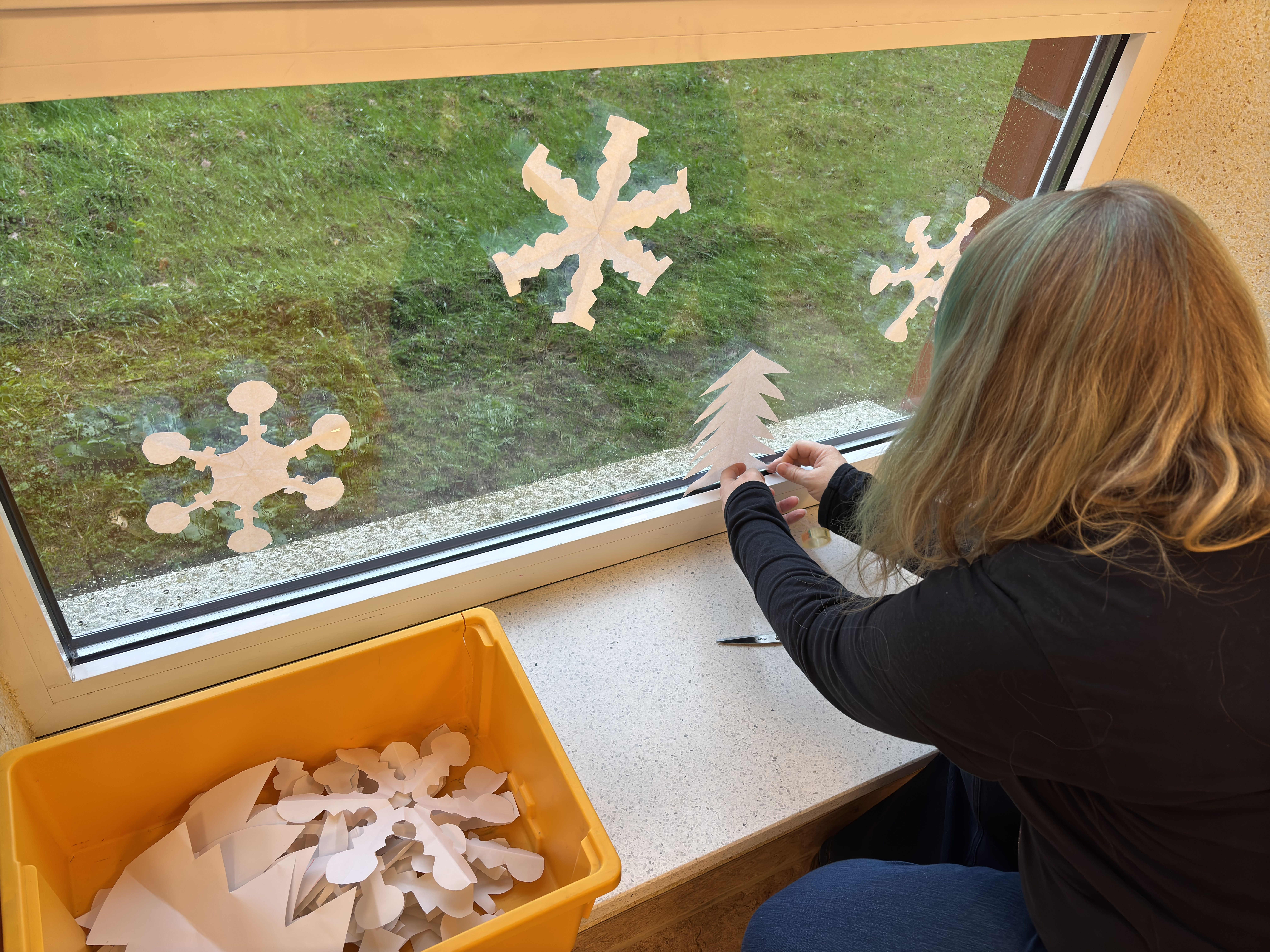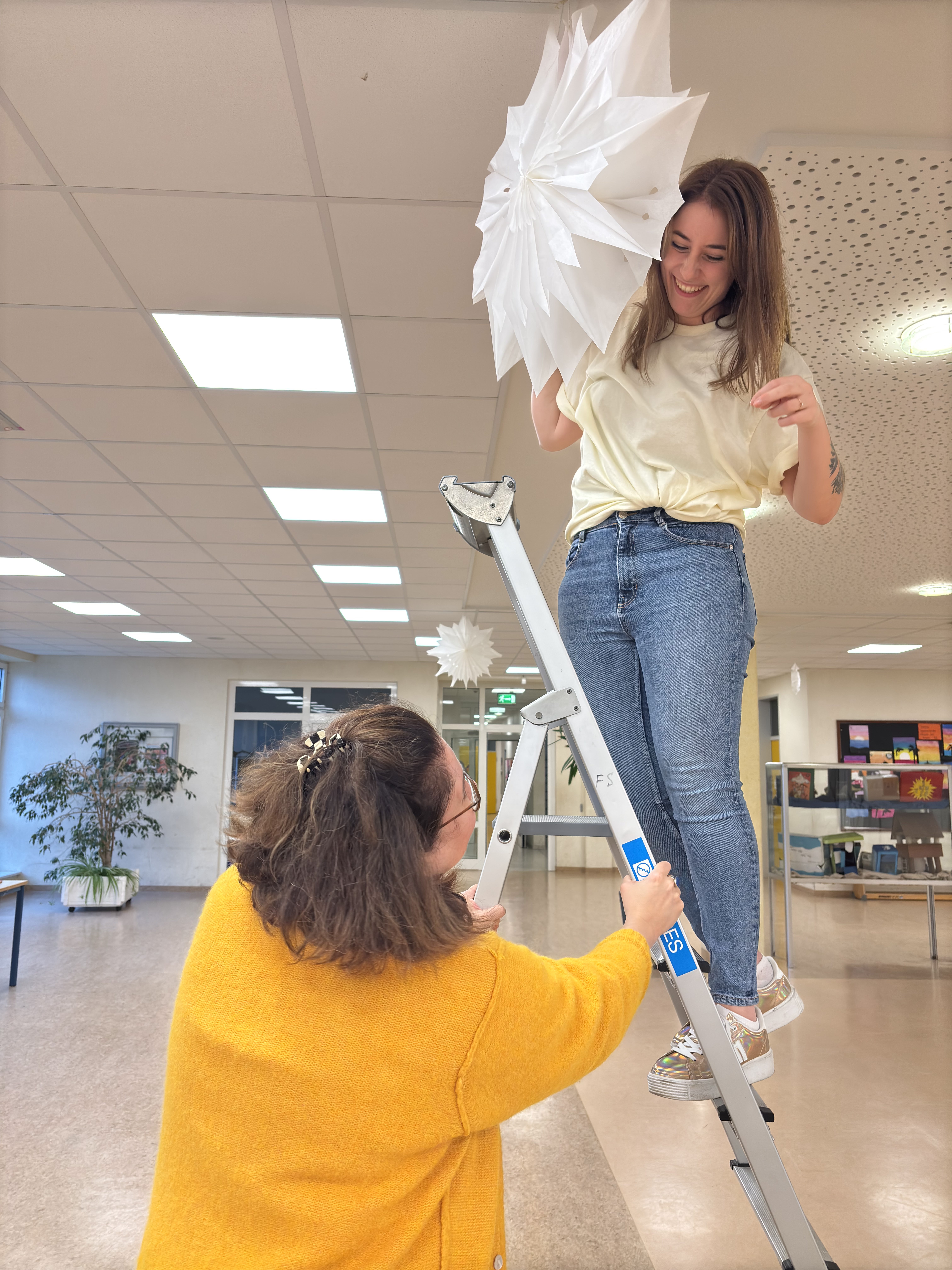 An beiden Standorten verzieren selbstgebastelte Weihnachtssterne die Decken. Ein aus Händen bestehender Weihnachtsbaum ist im Foyer in Pewsum zu sehen. Feierlich geschmückte Weihnachtsbäume verschönern den Eingangsbereich und die Mensa in Hinte. Vor allem dank des tatkräftigen Einsatzes von Herrn Kusche und Herrn Hoffmann erstrahlt das Gebäude in Hinte dank vieler Lichterketten jeden Morgen. Darüber hinaus gilt ein großer Dank allen Schülerinnen, Schülern und Beschäftigten unserer Schule, die dazu beigetragen haben, dass "It's beginning to look a lot like Christmas" an unserer Schule allgegenwärtig ist.