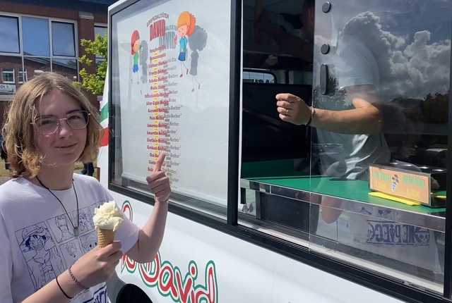 Gerade unsere fünften Klassen staunten nicht schlecht, als David mit seinem Eiswagen vorfuhr. Alle Schülerinnen und Schüler wurden mit einem Eis versorgt und auch die Lehrkräfte ließen sich nicht zweimal bitten.