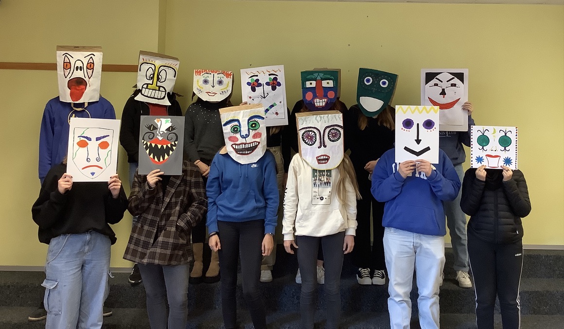Die Aufgabe bestand daraus, sich ein maskenartiges und reduziertes Gesicht oder Selbstporträt auf einer Tüte/Plakat zu gestalten.