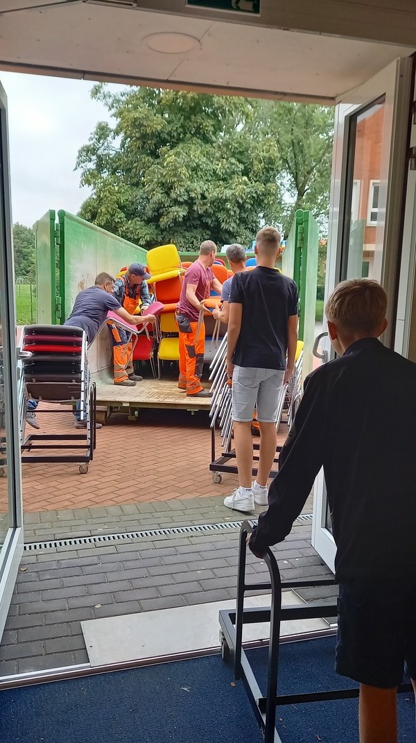 Die Schüler*innen der 9d haben den Männern kurzerhand ihre Hilfe angeboten und sehr motiviert Stühle von A nach B gebracht und aufgestellt. Im Anschluss gab es ein dickes „Dankeschön!“.