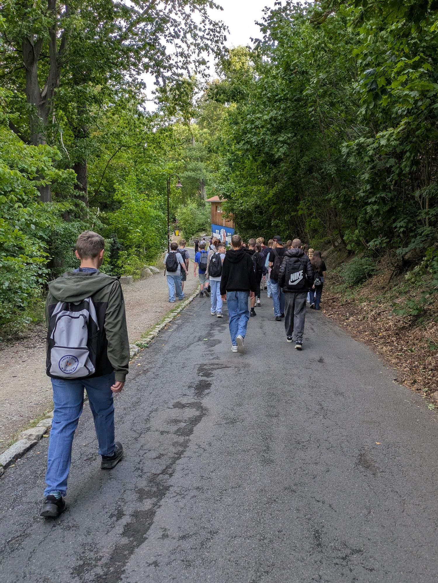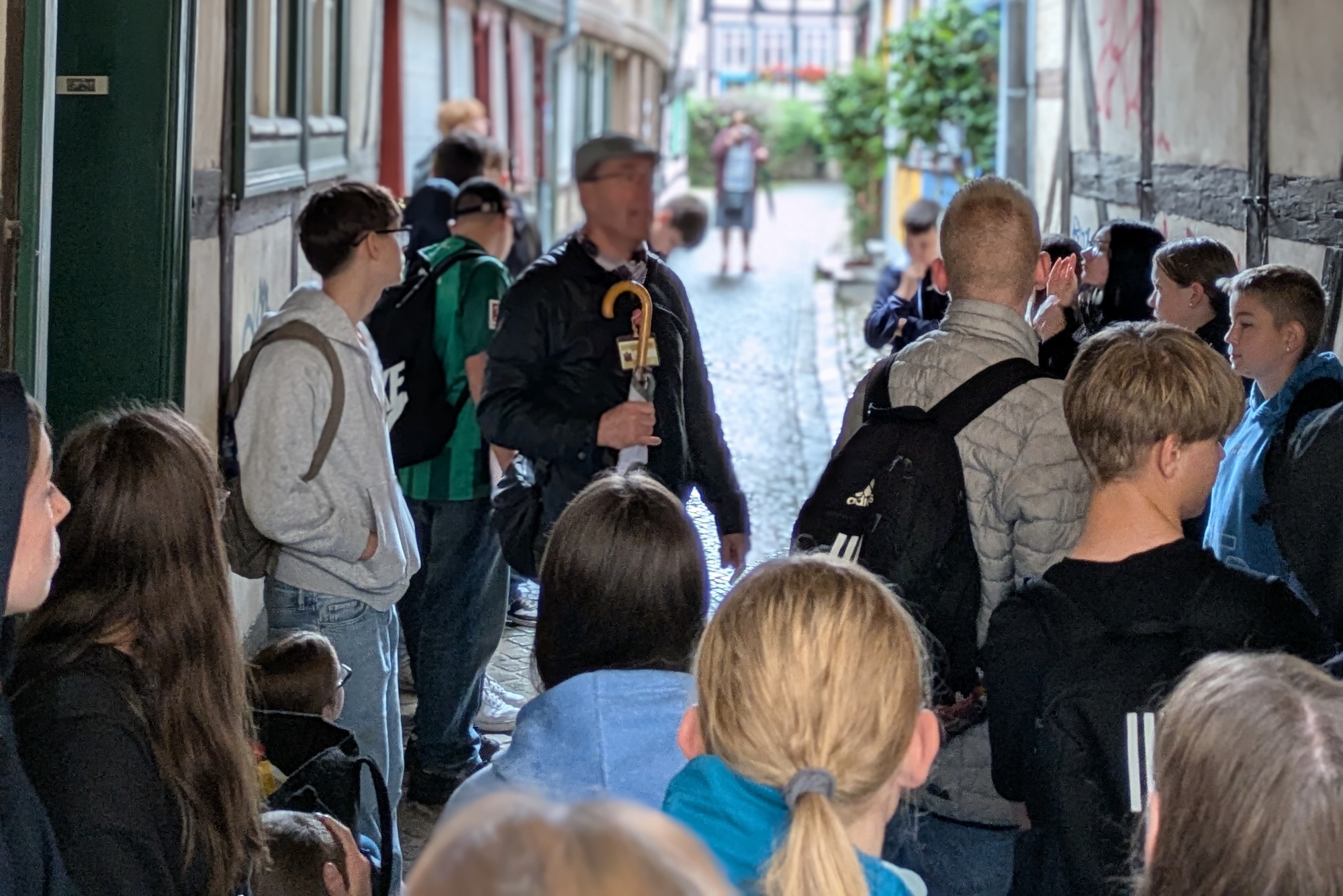 Heute tauschte das Programm. Während die 8c und 8d die Wanderung im Nieselregen absolvierte, machten sich die 8a und 8b nun auf den Weg nach Quedlinburg. Der Regen verzögerte den Aufbruch ein wenig, doch aufhalten ließ sich davon niemand. Mit Uwe dem Tischler begab sich die 8a und 8b auf eine Stadtführung durch die Schuhgasse, zum Monument Johann Christoph Friedrich GutsMuths und entlang vieler Fachwerkhäuser, die den historischen Wert der Stadt vermittelten. Nach Bummeln, Pommes und Bowling ging es mit dem Zug zurück.