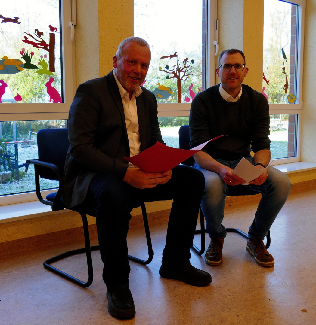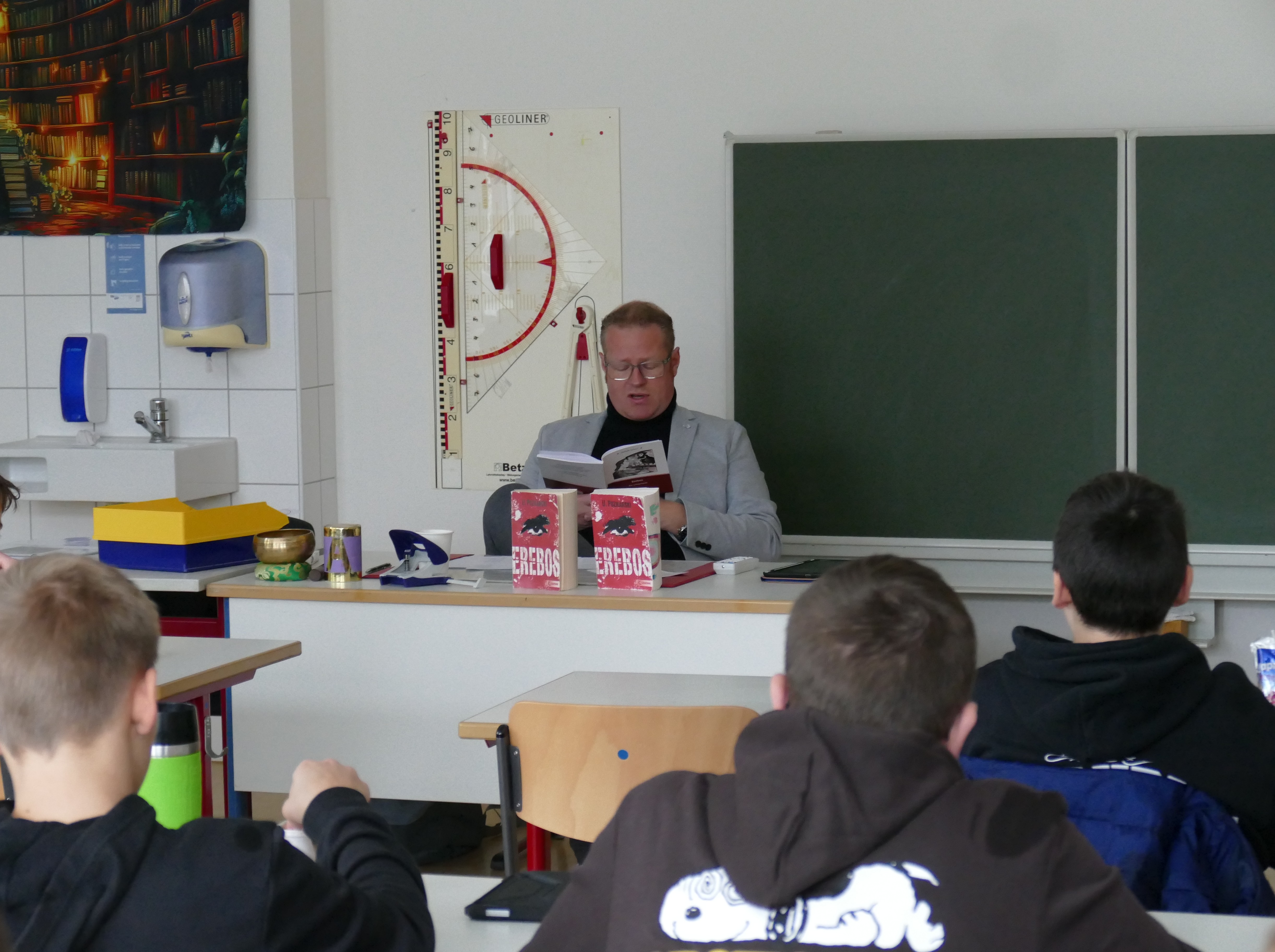Am Ende der erfolgreichen Bücher-Schatzsuche las unser zweiter Ehrengast, Bürgermeister Uwe Redenius (Hinte) dem 5. Jahrgang in der Pausenhalle eine Geschichte über das Schöfeln in Hinte vor.