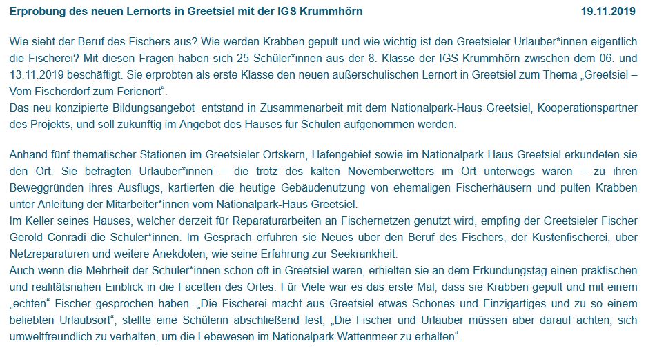 Bereits im November 2019 erprobten Schülerinnen und Schüler der Klasse 8c in Greetsiel den neuen außerschulischen Lernort zur Fischereiwirtschaft mit dem Thema "Greetsiel - Vom Fischerdorf zum Ferienort". Dieses Projekt wurde initiiert vom Kompetenzzentrum Regionales Lernen der Universität Vechta unter der Leitung von Annemarie Castillo und in weiterer Kooperation mit den Mitarbeiter/-innen des Nationalparkhauses Greetsiel. Die Schülerinnen und Schüler konnten an verschiedenen Stationen in Greetsiel Einblicke zum Strukturwandel des Ortes gewinnen und auch Informationen aus erster Hand, wie z.B. des Fischers Gerald Conradi erlangen. Das Projekt wurde jeweils mit einer Vorbereitungs- und einer Nachbereitungsstunde in der Schule vor- bzw. nachbereitet. Die Klasse konnte bei diesem Projekt viele interessante Informationen aus ihrer direkten Heimatregion erhalten.